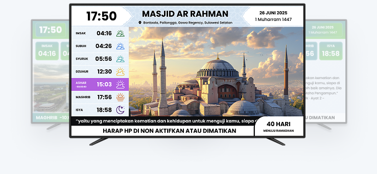 Ubah TV masjid Anda menjadi sistem jam sholat digital yang canggih dan interaktif.